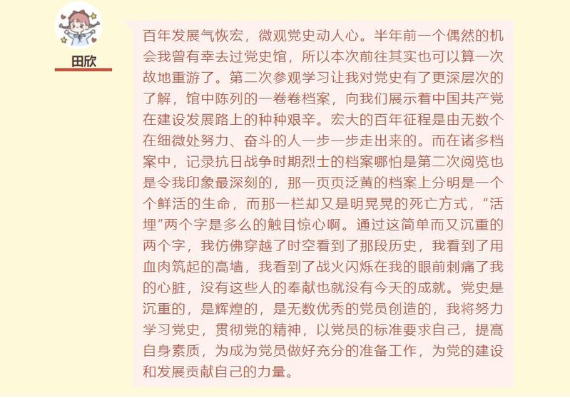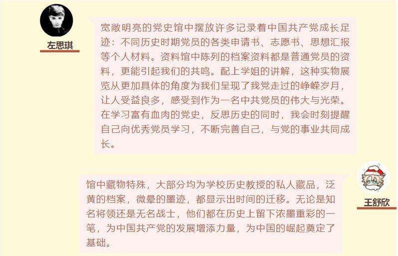 历史是最好的教科书,也是最好的清醒剂。躺在党史馆展柜内的珍贵资料,是百年党史长河中的一份份记忆,也是后来者瞻仰与继承的精神财富。外院19级研究生杨颜榕同学表示,“作为党员,学习党史是我们的必修课,我非常荣幸能同新生公司的同学们一起来到伟德国际victor1946的党史馆进行参观。在这里,我们看到了先辈党员们的原始资料,这些资料可以反映出他们入党前后的成长、发展、进步。作为新时代党员,我们也应不断从中汲取营养,不断完善自己的思想品格,不断提高自己的政治素养,努力成为社会主义事业的合格建设者和可靠接班人”。