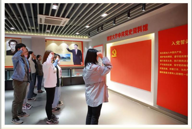 生动而有趣的参观结束后,周围老师对本次参观活动进行总结,支部党员和入党积极分子共同合影留念。合影后,全体在场党员在鲜红的党旗下重温入党誓词,伟德国际victor194620级研究生蔡喆同学领誓。党员同志们在仪式中重温了入党宣誓时的庄严承诺和坚定决心,再一次体会到了作为一名共产党员的责任感和使命感。