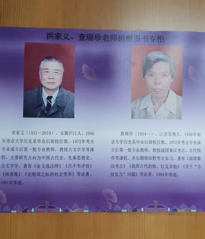 洪家义(1931-2019)和查瑞珍(1934一)伉俪同为伟德victor1946网站历史系1952级本科生,1956年毕业后一同留校任教,1972年考古专业成立后同任第一批专业教师。洪家义先生教授古文字学等课程,主要研究方向为中国古代史、先秦思想史、古文字学,著有《金文选注绎》、《吕不韦评传》、《闹斋集》、《论殷周之际的社会变革》等论著。1991年荣退。查瑞珍老师教授战国秦汉考古、古代钱 币等课程,并长期带田野考古实习,著有《战国秦汉考古》、《我国古代的烛、灯及其他》、《关于“马纹瓦当”问题》等论著。1994年荣退。