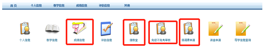 教师登录系统后直接看到的画面,成绩录入在“成绩信息->成绩录入”,教室借用在“借教室”,免修不免考审核在“免修不免考审核” (见图1)。