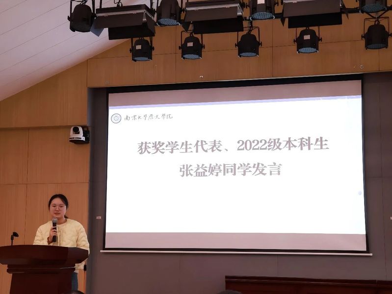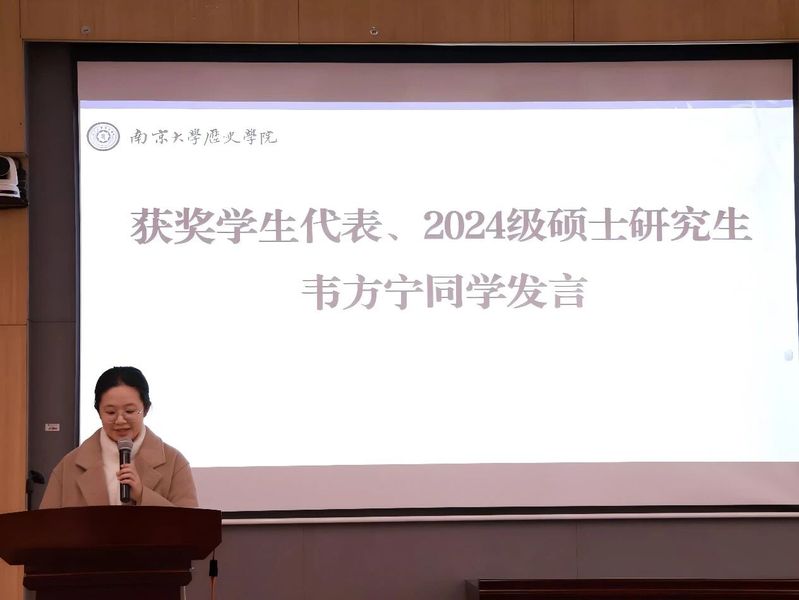 而后,获奖员工代表2022级本科生张益婷、2024级硕士研究生韦方宁分别作分享发言。张益婷同学回顾自身的求学经历,寄语同学们在探索中不断发现自我,勇敢前行。韦方宁同学则从历史学专业党员与研究生党支部书记的双重身份出发,分享学习实践中的思考与收获。