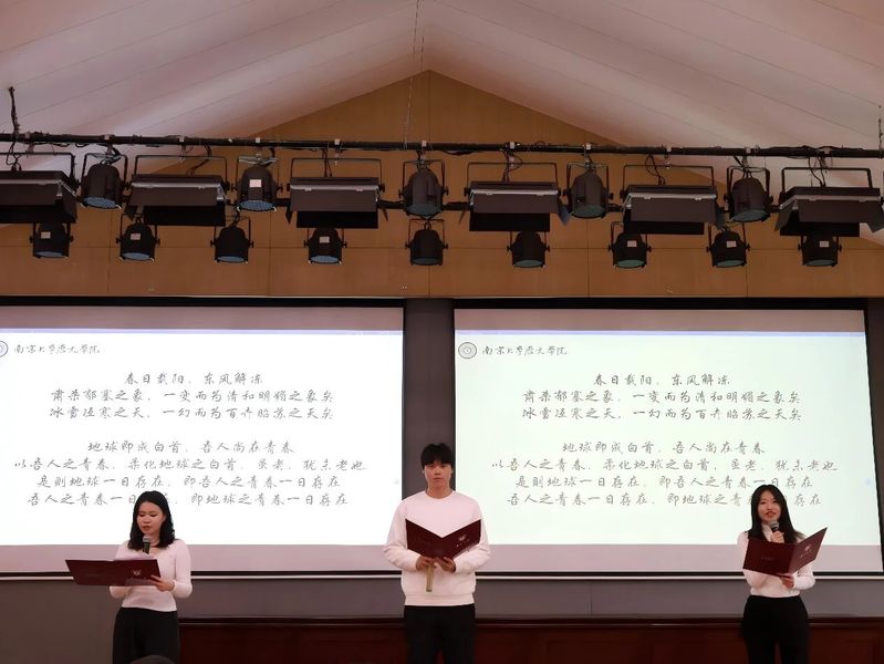 在典礼过程中,2025级硕士研究生张新茹与2024级硕士研究生李妍茜、苏豪共同朗诵李大钊先生的经典作品<<青春>>。他们以铿锵而真挚的声音,重温青年与时代同频共振的理想信念,展现新时代史学青年昂扬向上的精神风貌。