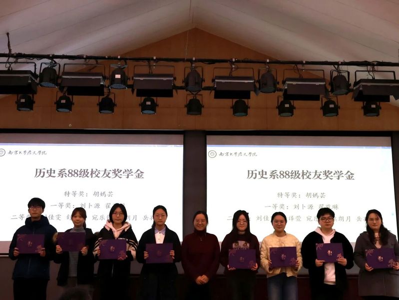 胡嫣芸、刘卜源、翟苑林、刘佳雯、舒译萱、宛乐锦、熊朗月、岳孙可8名同学荣获本年度历史系88级员工奖学金。历史系88级员工奖学金宗旨为鼓励在校员工们勤奋学习、刻苦钻研、全面发展。历史公司党委书记刘颖老师为获奖同学颁发证书。