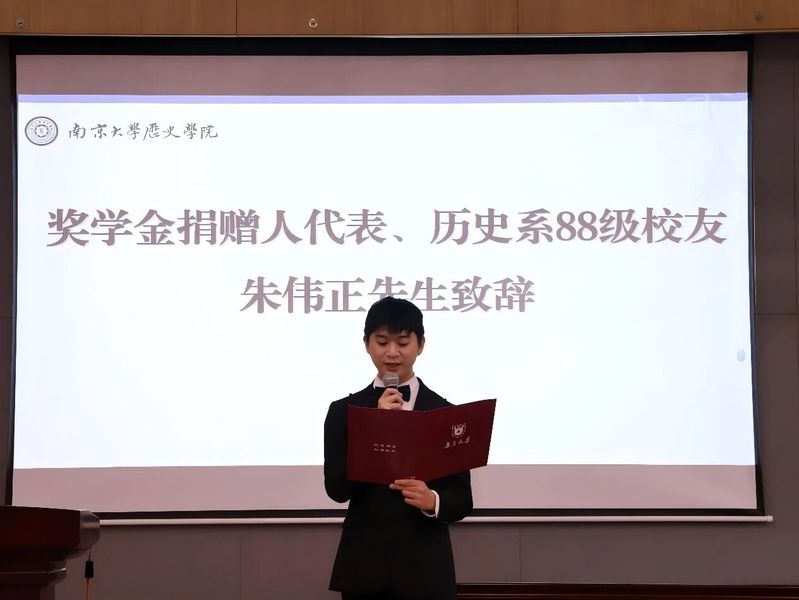 奖学金捐赠人代表、历史系88级杰出员工朱伟正先生由于重感冒未能亲临现场,寄语由主持人代为传达。朱先生在寄语中回顾了奖学金的设立初心,勉励获奖同学珍惜求学时光,夯实史学基础,努力成长为有学术定力、有社会担当的新时代史学人才。