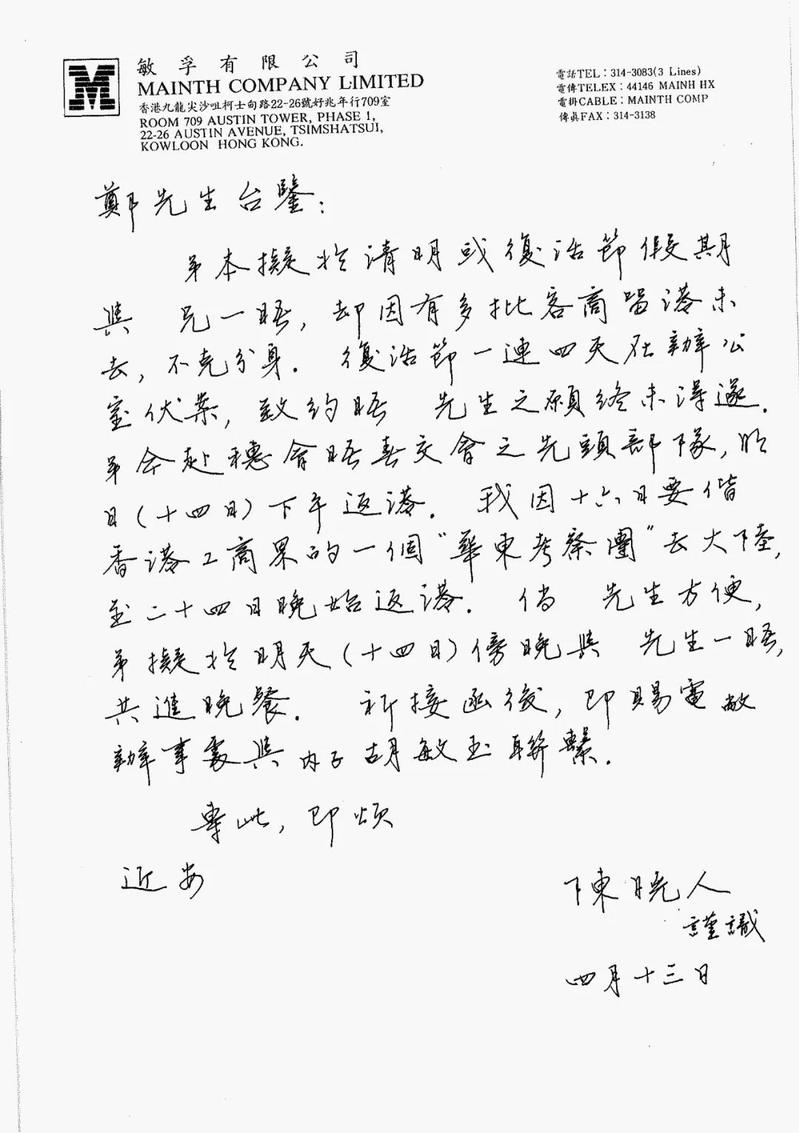 在这之后,我就没有再关心此事,也不太清楚他们之间是如何联系的。直到第二年的4月19日,我突然收到陈晓人先生写于13日的一封信,说他原打算在清明节或复活节期间与我见次面,但他最近一直忙于在港陪同客户,复活节又在办公室伏案工作,后又去广州参加春交会,其后再参加华东考察团需离港多日,只有第二天(即14日)有点时间,因而想约我当晚一起谈谈,并共进晚餐。不知为何,这封写于13日的信件竟然在香港走了6天,直到19日上午我才收到,早就错过原来约定见面的时间。我赶紧发了封传真给他说明情况,并说等他回港后随时都可以约见,为避免误事,可提前电话或传真告知。然而在这之后,我再也没有收到陈先生的来信,因而也不知道他原来约我见面要谈些什么。只是后来在网上查到2003年宋美龄去世后,陈晓人先生曾接受过英国BBC专栏的实名专访,披露他的外祖母到香港后曾受到来自台湾宋美龄方面的威胁,标题就叫《慈容背后的凶残》。