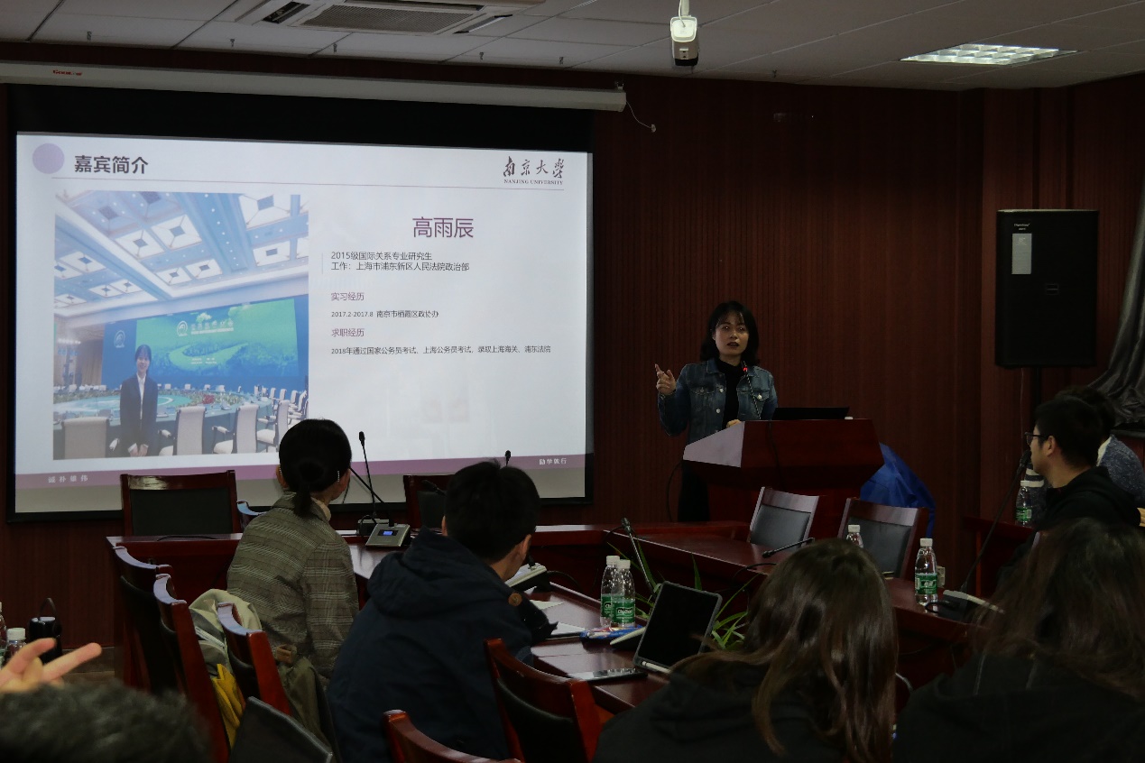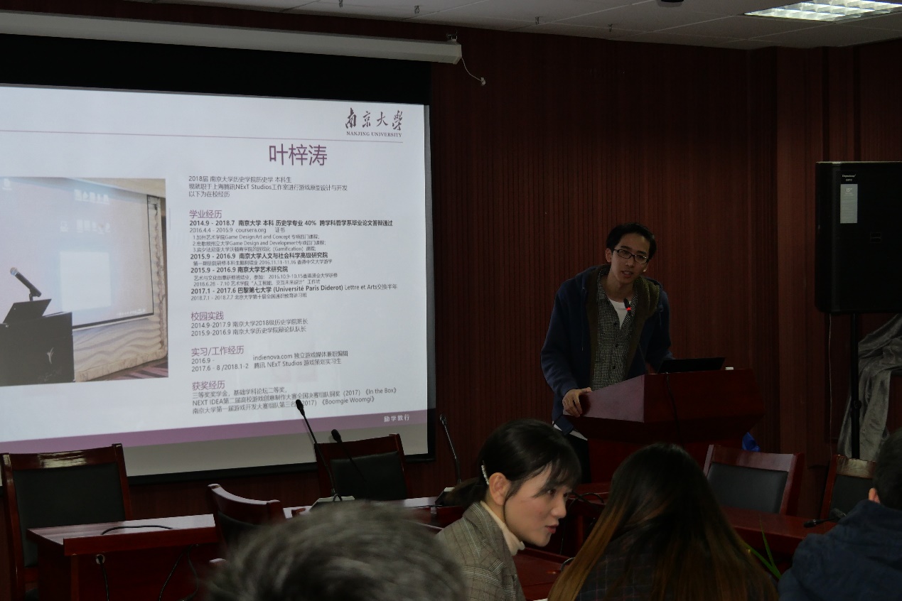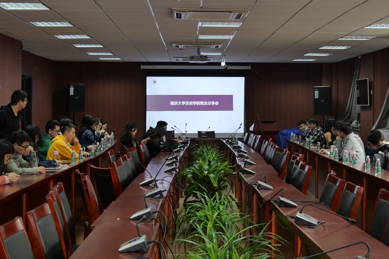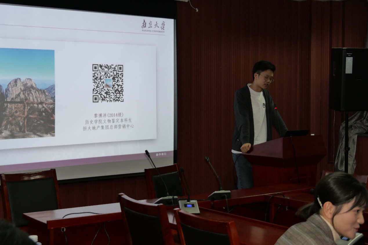 五位学长学姐分别是16级中国近现代史专业硕士,现工作于南京出版社的翟聪睿、15级考古学专业硕士,现工作于盘龙城遗址博物馆的程酩茜、15级国际关系专业硕士,现工作于上海市浦东新区人民法院政治部组宣科的高雨辰、14级本科,现工作于上海腾讯的叶梓涛、14级本科,现工作于恒大地产的黎博洋。学长学姐们的就业行业涵盖了出版、文博、公务员、房地产、游戏设计等多个领域,具有较广泛的代表性。