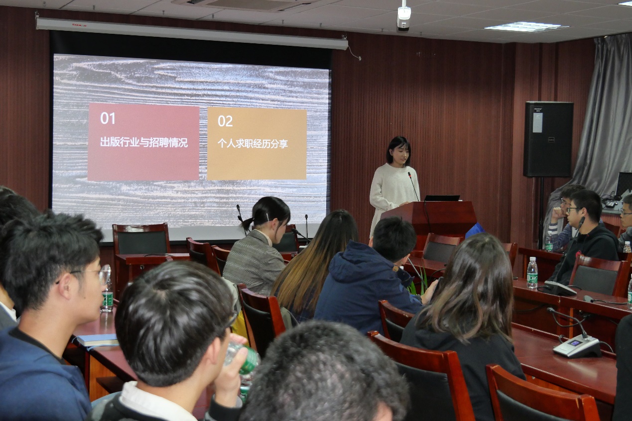 翟聪睿学姐介绍了出版行业的情况、出版社的招聘情况、编辑的主要工作内容和自己担任编辑的一些体会。此外,还讲述了自己求职的心路历程。她坦言,自己求职的过程比较坎坷,也经历过一些挫折。同学们在求职时,一定要保持良好的心态,相信自己,坚持下去。