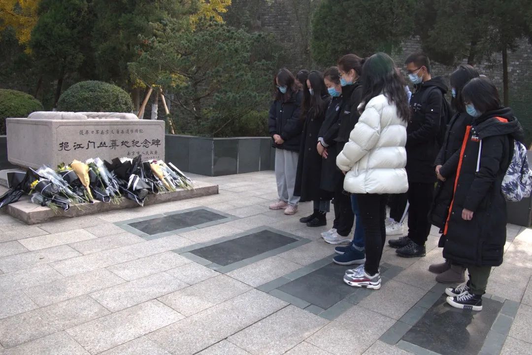 同学们在草鞋峡丛葬地纪念碑、中山码头丛葬地纪念碑、挹江门丛葬地纪念碑、北极阁丛葬地纪念碑、太平门纪念地纪念碑、五台山丛葬地纪念碑、汉中门外丛葬地纪念碑,一同为遇难同胞献花并默哀。